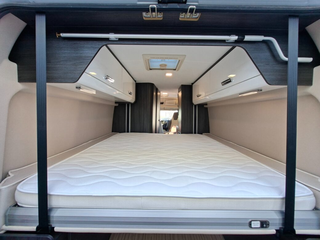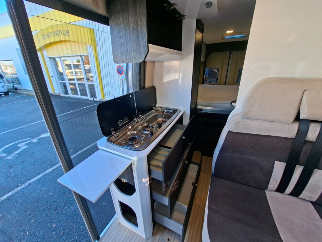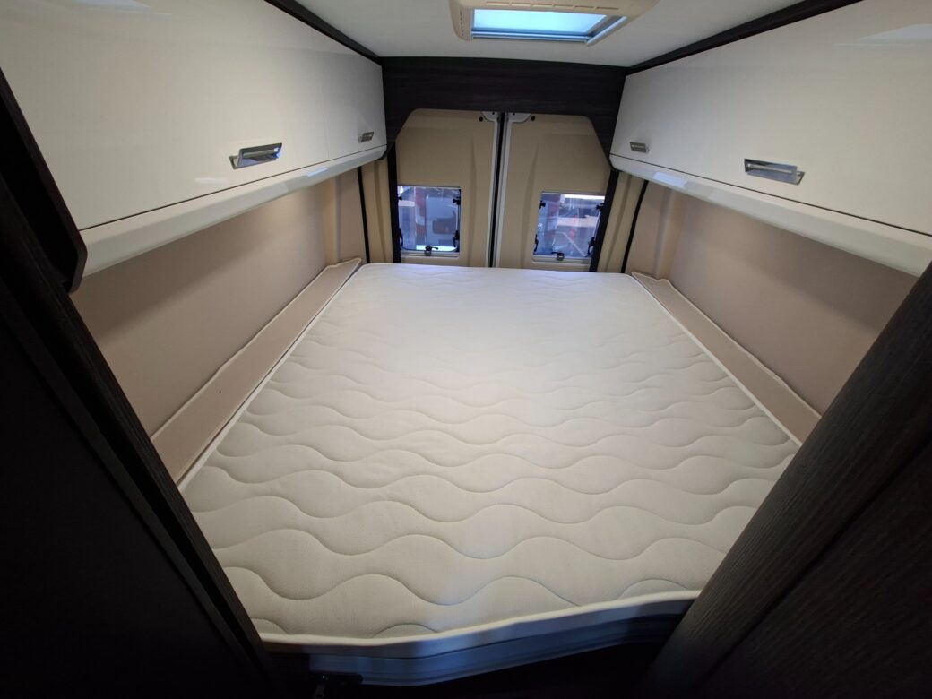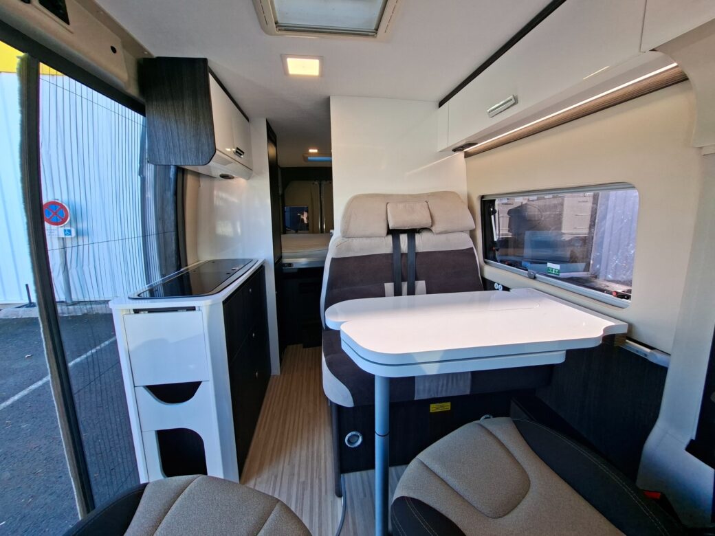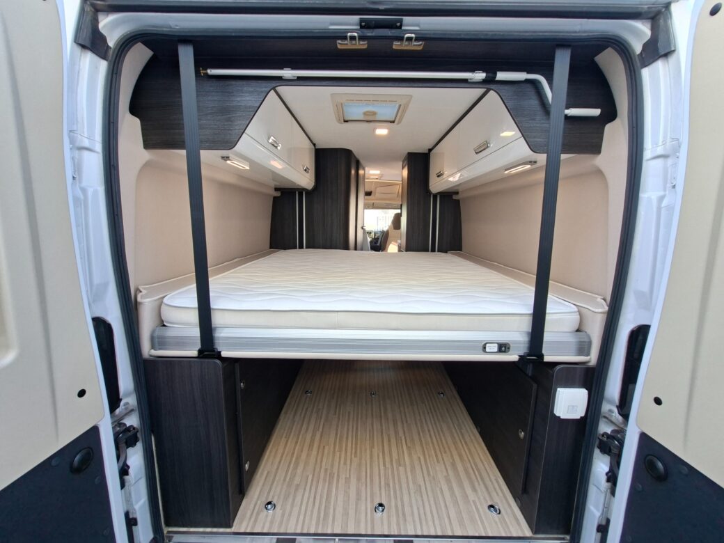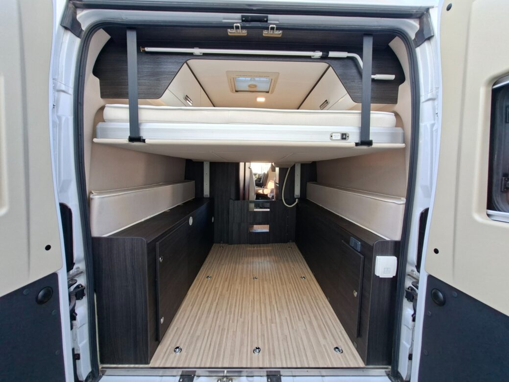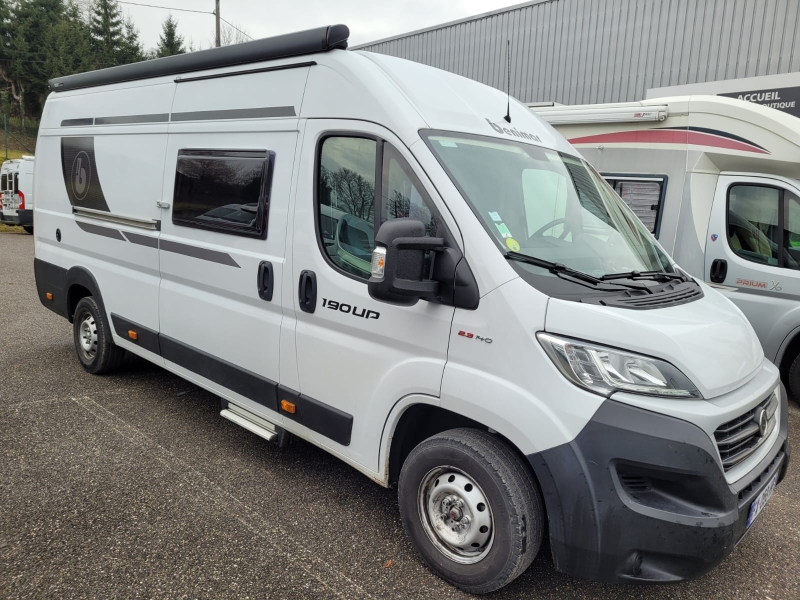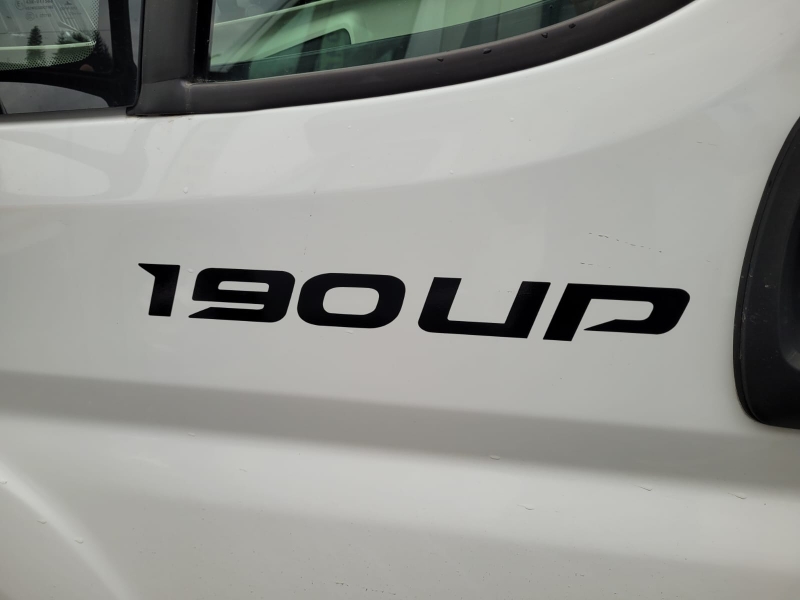 Le 190Up est un fourgon aménagé sur base Fiat Ducato, il possède un lit longitudinal réglable pour offrir une grande soute, un bloc cuisine avec réfrigérateur (12V / 220V / Gaz) et d’une salle de bain avec douche et toilettes.