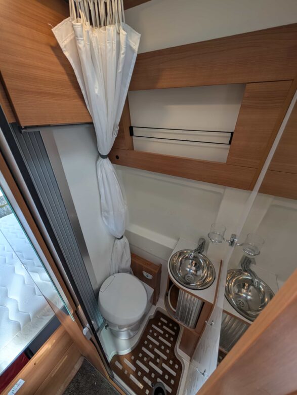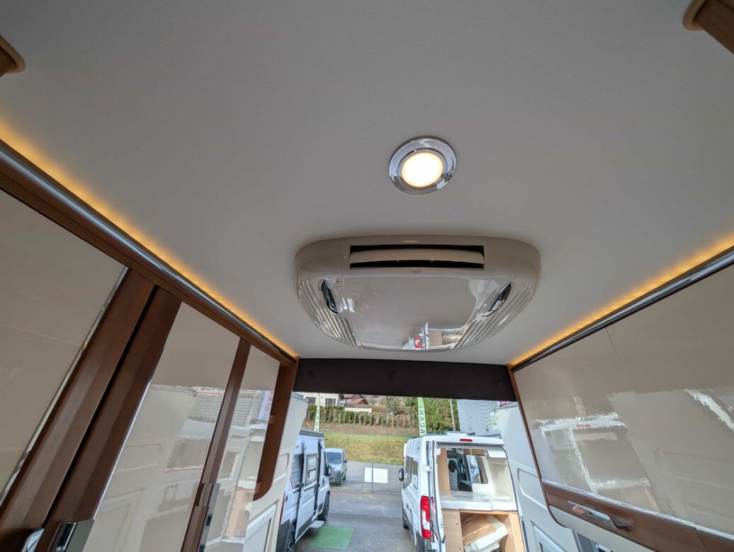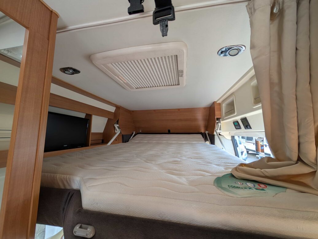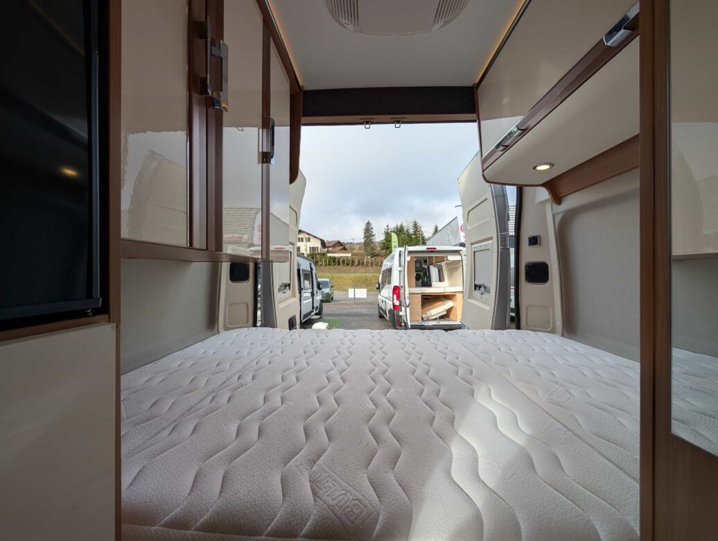L’implantation est composée d’un lit double transverssal, d’un lit de pavillon (1900 x 1300), d’une dinette à l’avant avec maxi-salon.