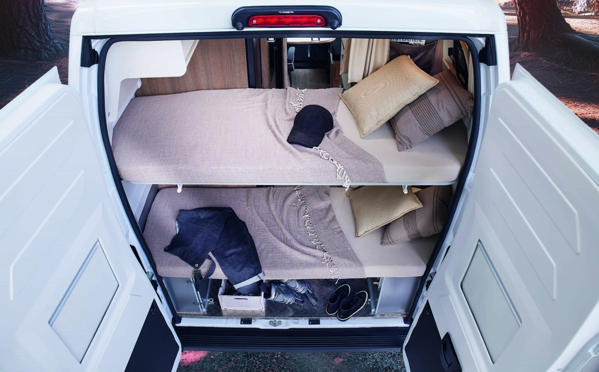 Grâce à une implantation réfléchie, ce fourgon aménagé familial dispose de différents couchages : lits superposés à l’arrière, lit de pavillon assisté par vérin et couchage convertible sur la banquette, pour accueillir toute la famille confortablement.