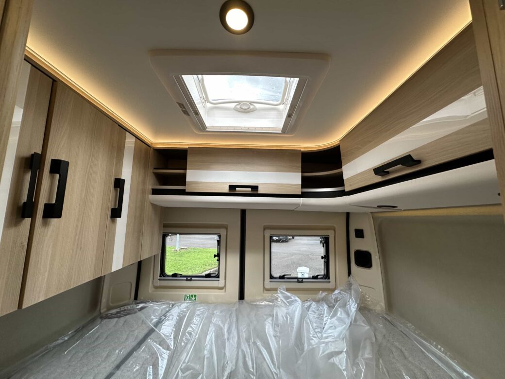 L’implantation est composée d’un grand couchage transversal 1900 x 1300, d’une vraie salle de bain transversale et privative, d’une penderie avec système Modul’Space, d’un grand réfrigérateur 135l à compression et d’un nouveau séjour avec banquette double sur rails.