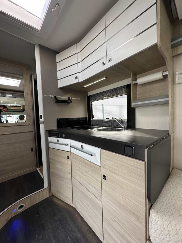 Implantation orientée pour les personnes cherchant un maximum d’espace et de confort, il offre un grand salon avec banquettes longitudinales, une cuisine longitudinale, un grand réfrigérateur avec recherche d’énergies automatique AES.