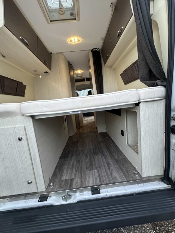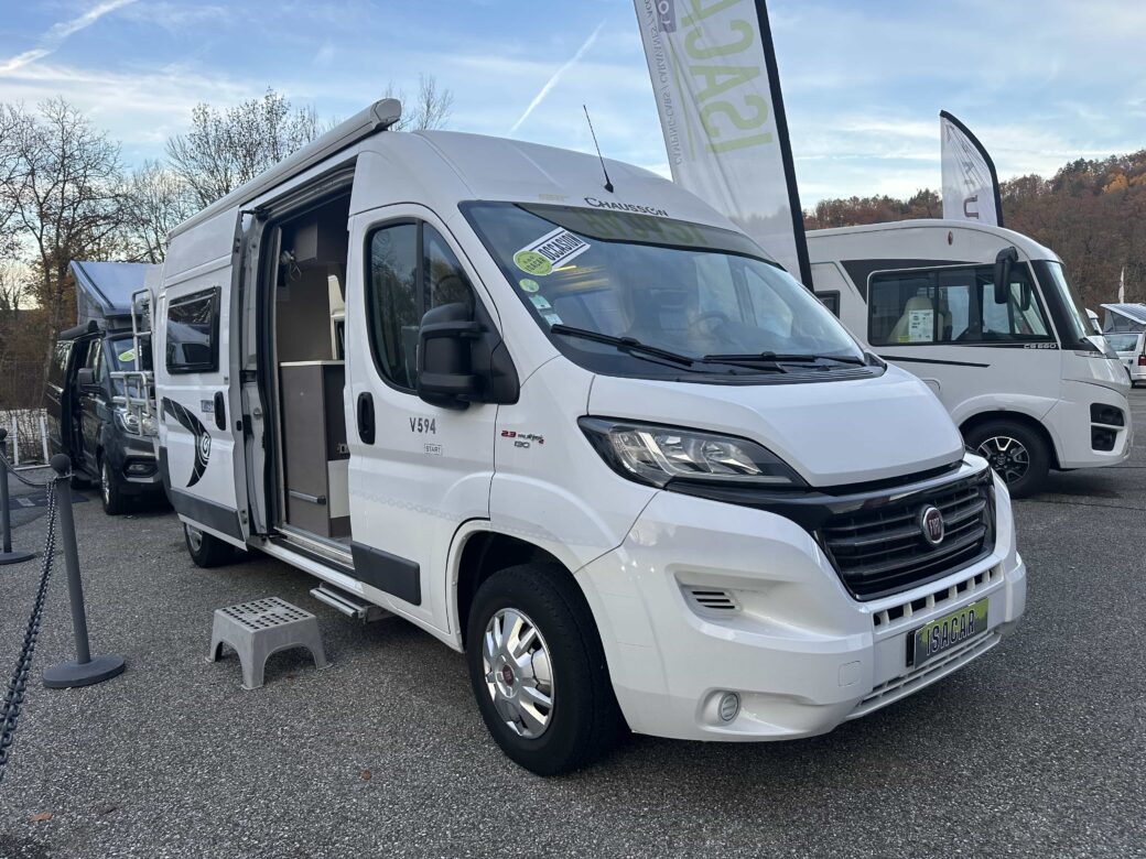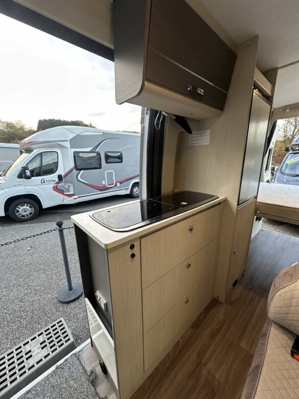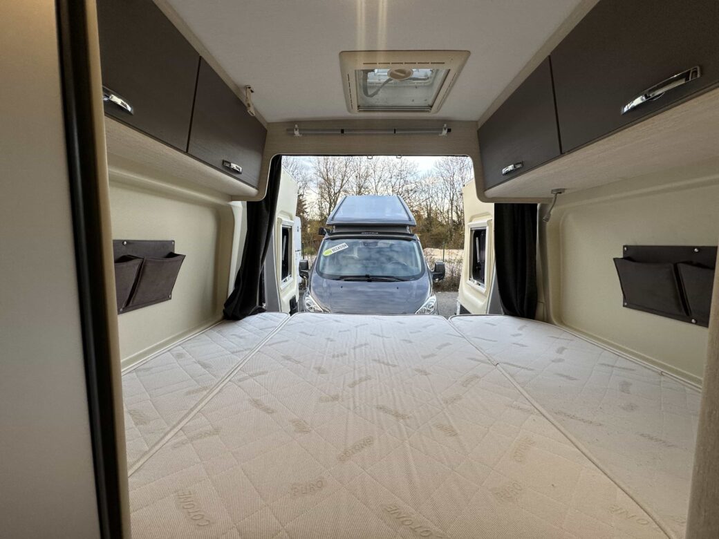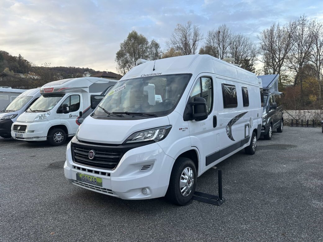 Modèle phare de la gamme du constructeur français Chausson, le V594 est un fourgon aménagé de 5.99m sur base Fiat Ducato, il a un lit transversal transversal sur soute, un bloc cuisine avec réfrigérateur (12V / 220V / Gaz) et d’une salle de bain avec douche et toilettes.