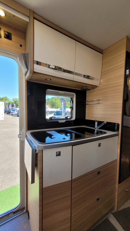 Il a gardé un très grand couchage transversal arrière sur soute garage, un bloc cuisine doté de nombreux rangements ainsi qu’une salle de bain avec douche et toilettes « séparés » grâce au système « Vario ».