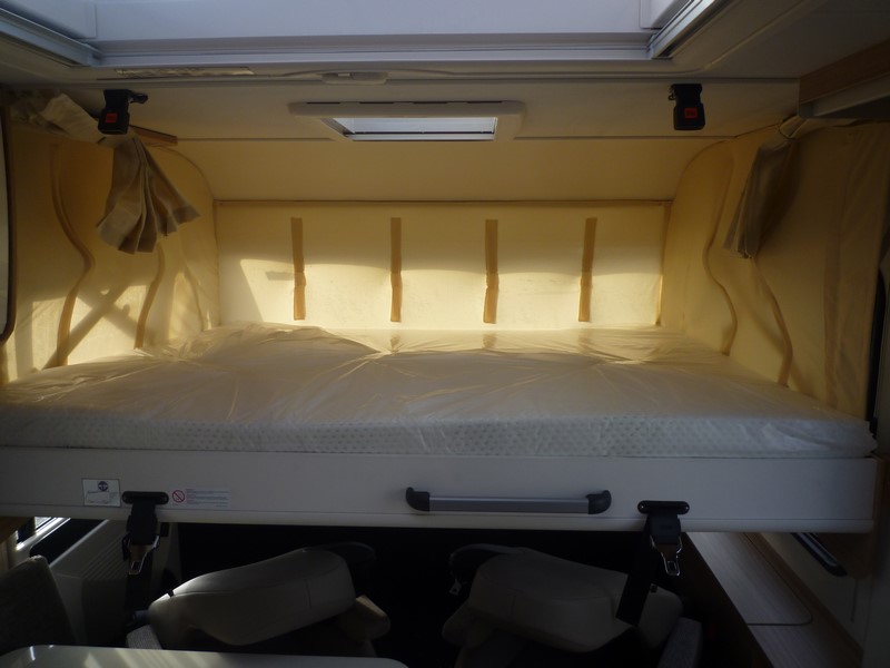 Il a gardé un très grand couchage transversal arrière sur soute garage, un bloc cuisine doté de nombreux rangements ainsi qu’une salle de bain avec douche et toilettes « séparés » grâce au système « Vario ».