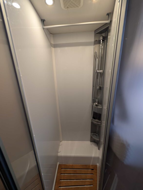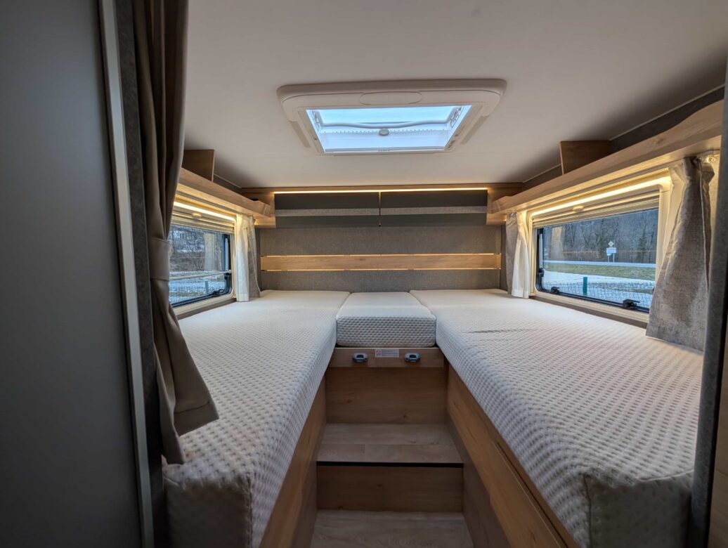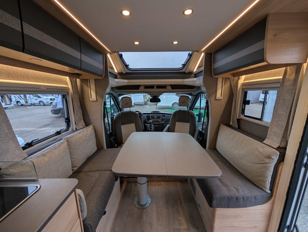Une chambre arrière avec lits jumeaux sur grande soute garage ainsi qu’un lit de pavillon électrique 2 places, la douche séparée des toilettes, une cuisine en L assortie d’un grand réfrigérateur, ainsi qu’un maxi salon avec banquettes longitudinales et sièges cabine pivotants.