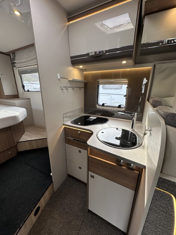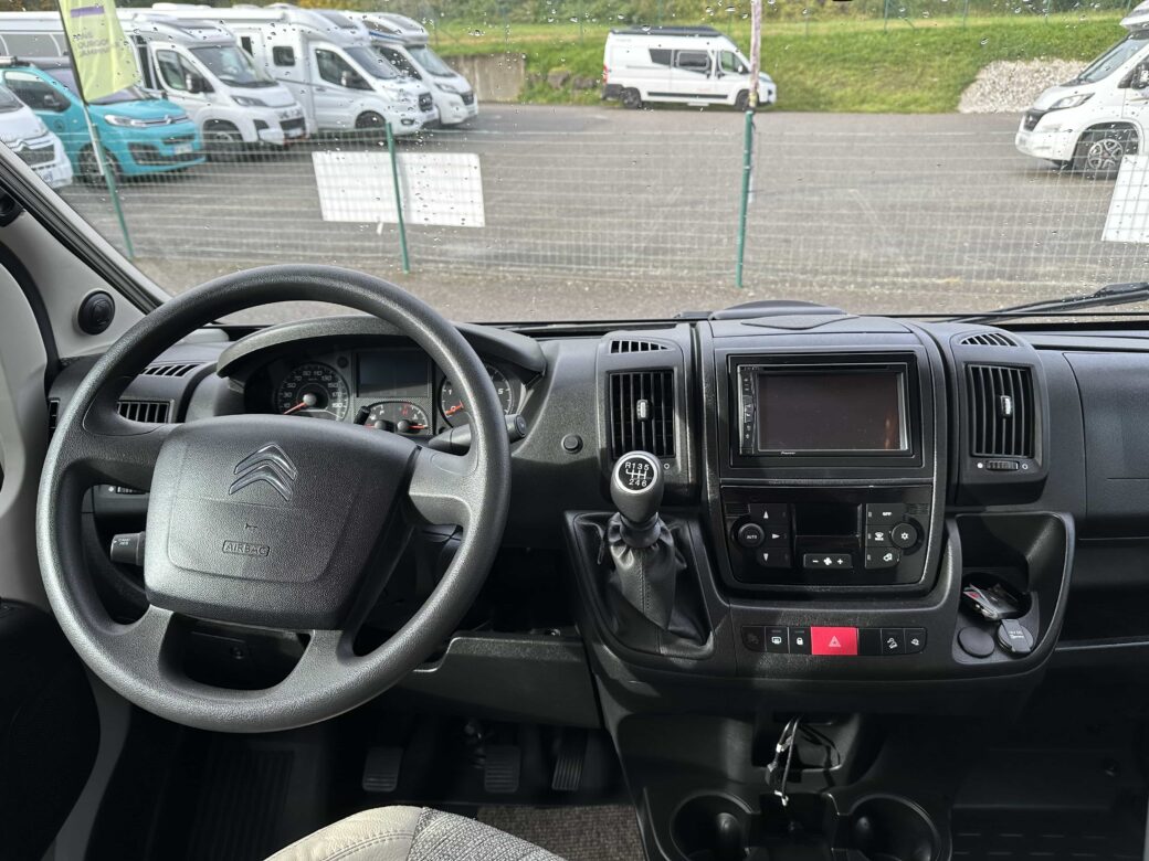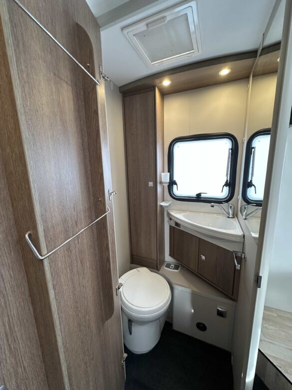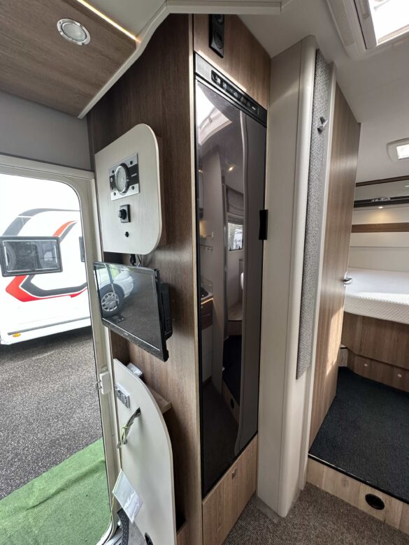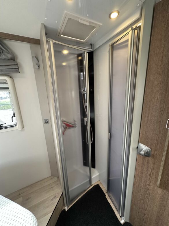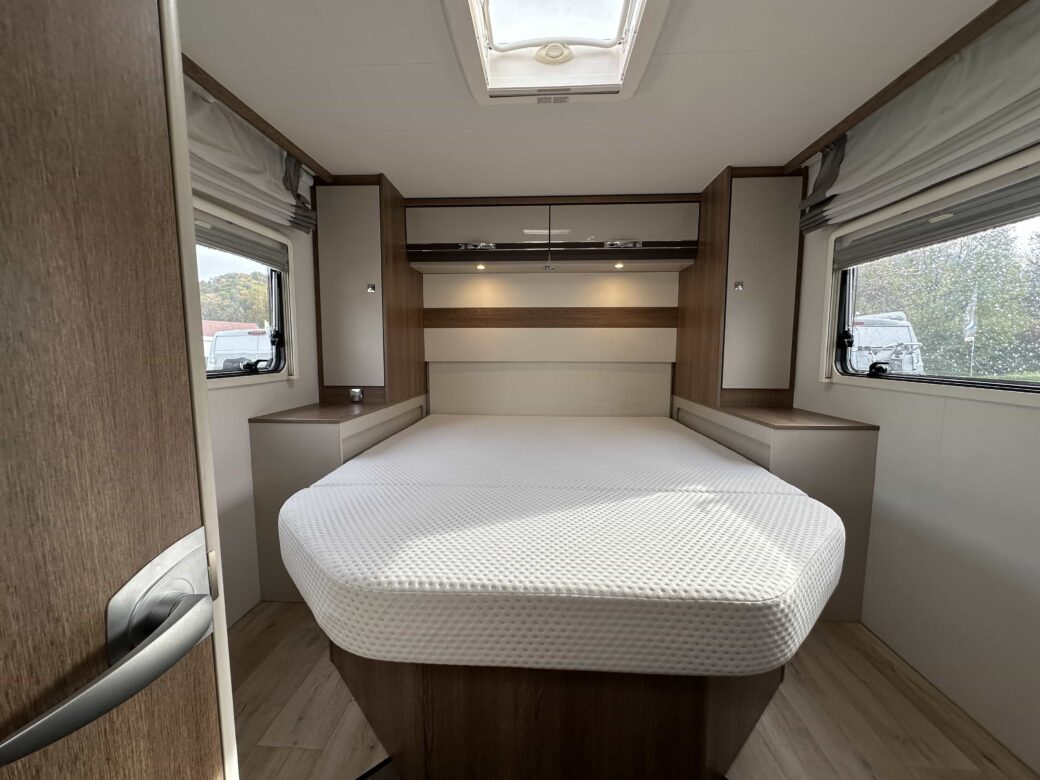 Une chambre parentale avec lit centrale de 150 x 190 ainsi qu’un lit de pavillon électrique (200 x 140), la douche séparée des toilettes, une cuisine en L assortie d’un grand réfrigérateur Slimtower, ainsi qu’un maxi salon avec sièges cabine pivotants.