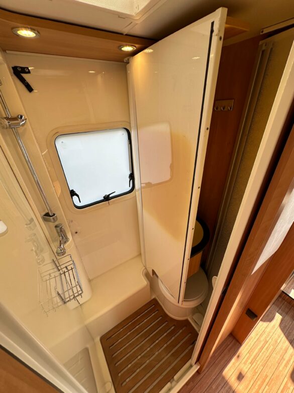 Son implantation offre deux lits jumeaux (transformables en grand couchage) sur grande soute garage, une salle de bain avec système de paroi « Vario », et un bloc cuisine avec un grand plan de travail.