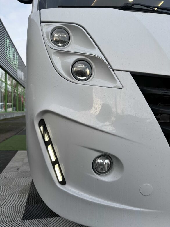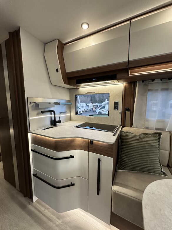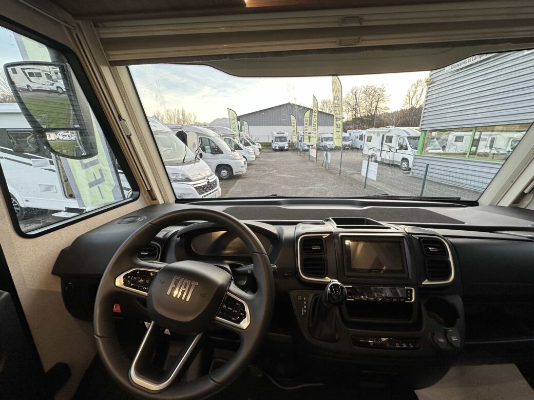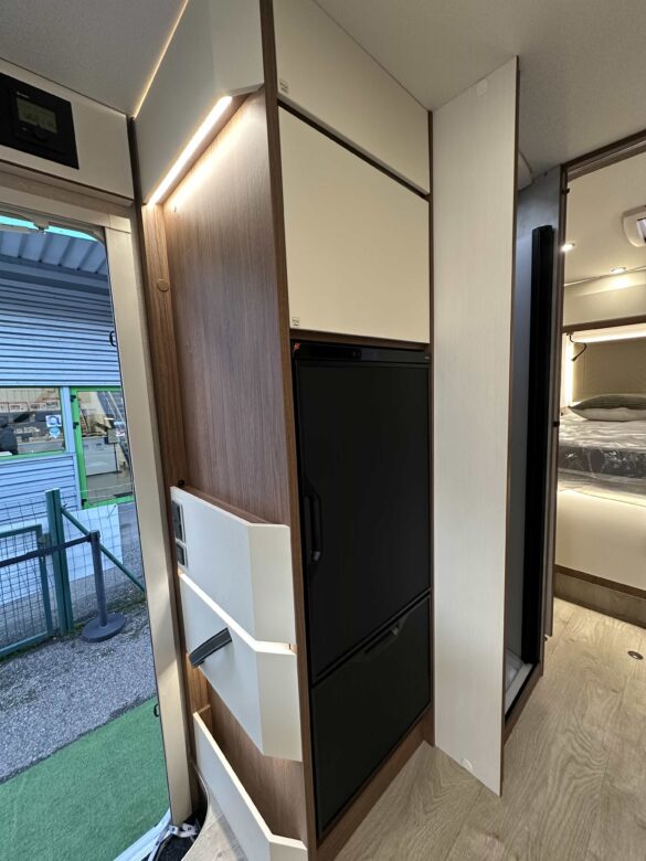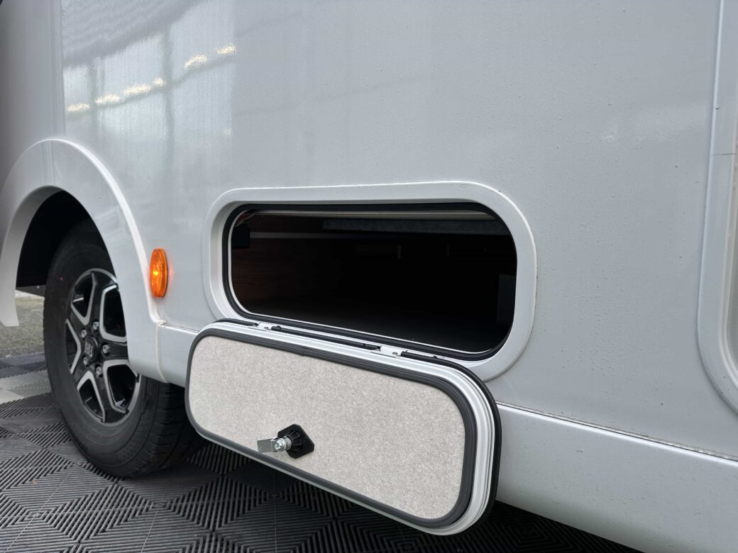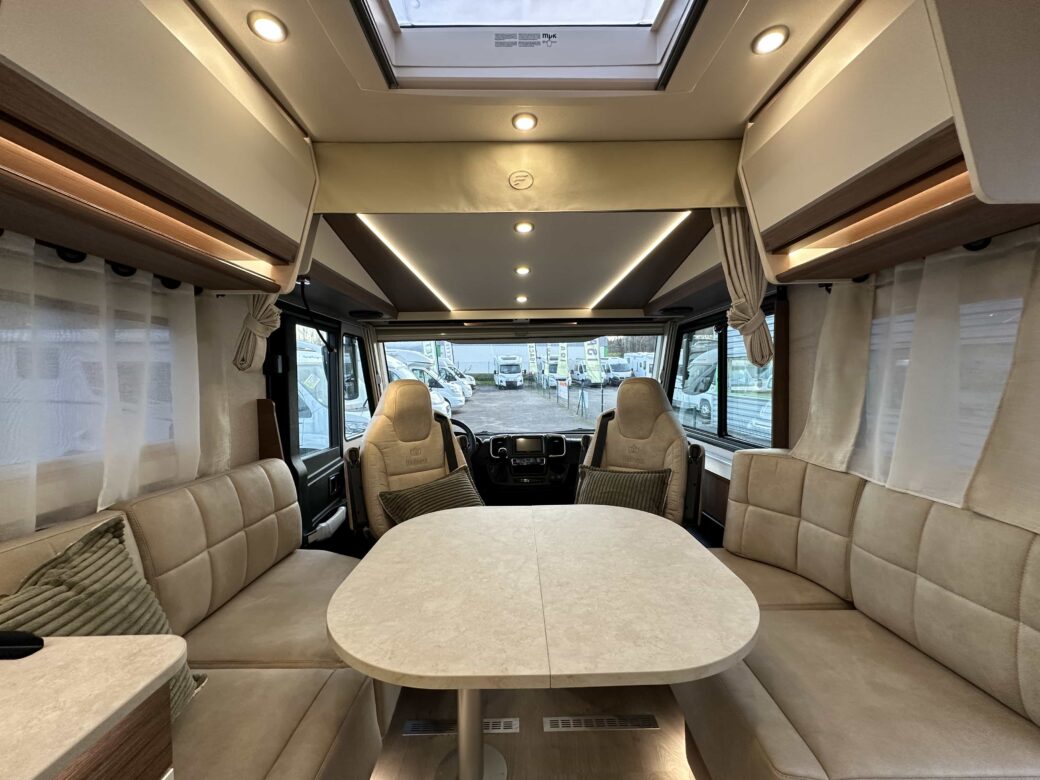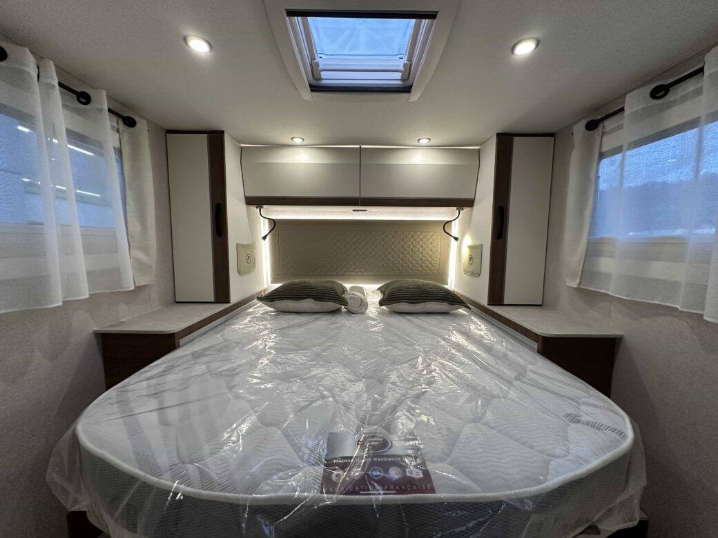 La disposition intérieure libère de grands espaces de circulation à l’intérieur du véhicule : un lit central réglable en hauteur électriquement, une salle d’eau transversale avec un double cloisonnement, une cuisine en L au plan inversé.