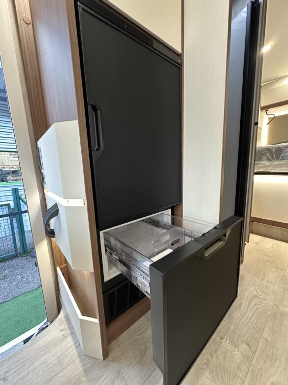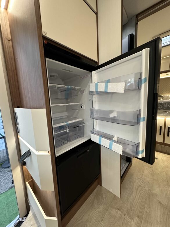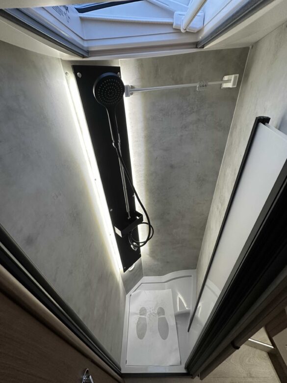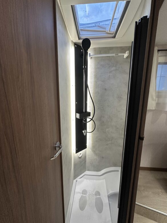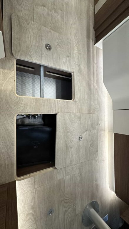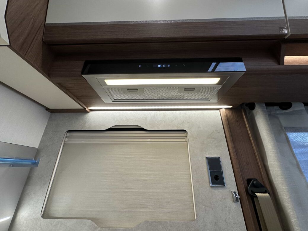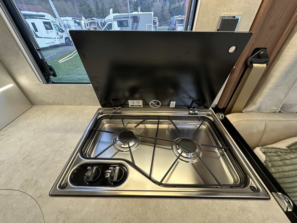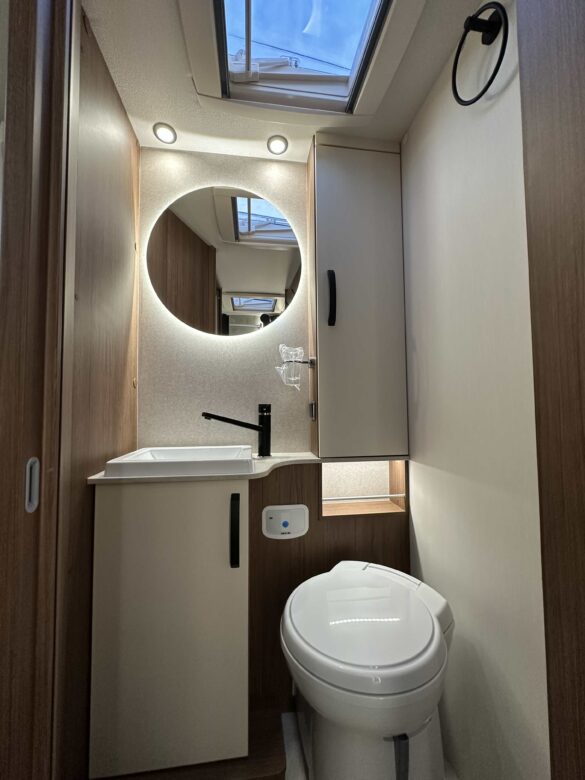 La disposition intérieure libère de grands espaces de circulation à l’intérieur du véhicule : un lit central réglable en hauteur électriquement, une salle d’eau transversale avec un double cloisonnement, une cuisine en L au plan inversé.