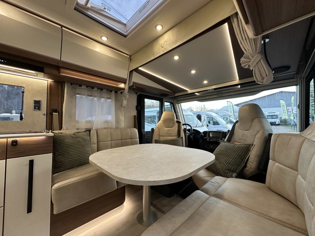 En position repas, cet intégral dispose d’un salon avec deux banquettes face à face, faisant de ce camping car 6 places assises.