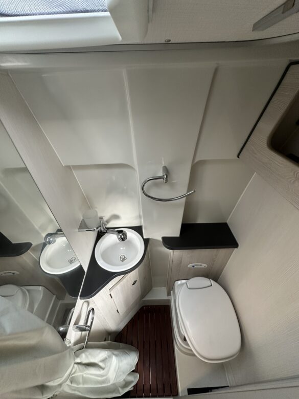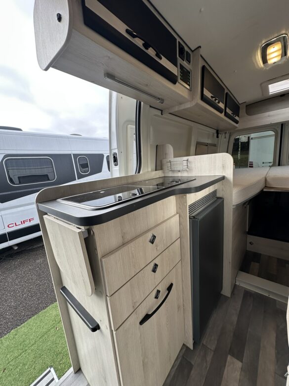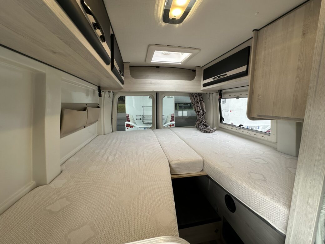 À l’intérieur, ce modèle présente un aménagement optimisé pour 2 personnes, avec deux lits jumeaux confortables, de nombreux rangements astucieux et un espace de vie lumineux. La cuisine est équipée de tout le nécessaire : réfrigérateur, réchaud, évier et plans de travail fonctionnels. La salle d’eau comprend douche, WC et lavabo, garantissant une véritable autonomie.
