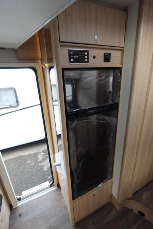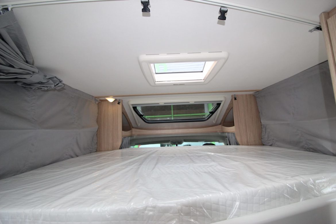 Son implantation avec lits jumeaux se veut idéale pour les familles, offrant jusqu’à 5 places carte grise et 5 couchages indépendant, elle permet également une très grande soute garage transversale avec deux très grandes portes d’accès. L’espace cuisine dispose d’un plan de travail en L avec de nombreux rangements en tiroirs coulissants et grand réfrigérateur.