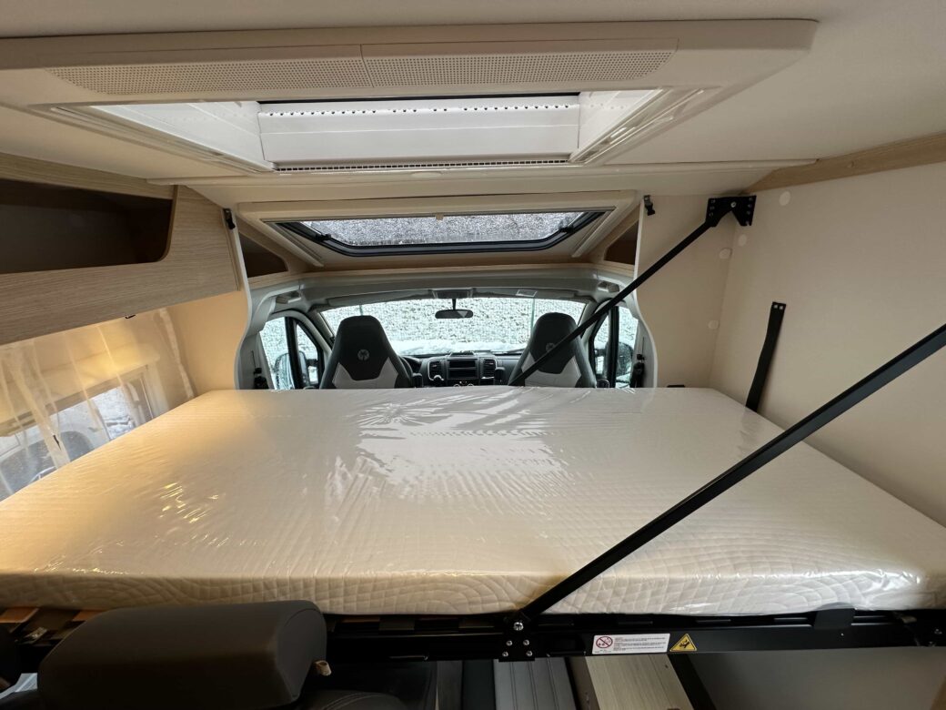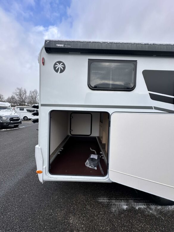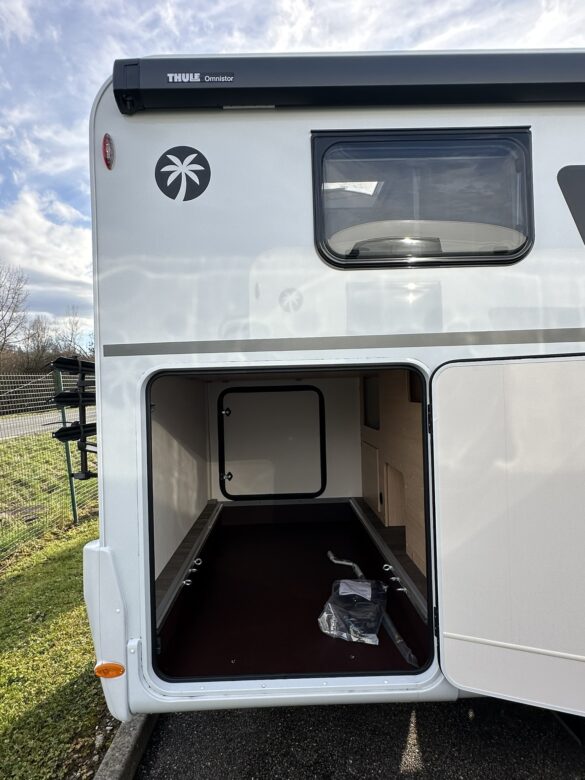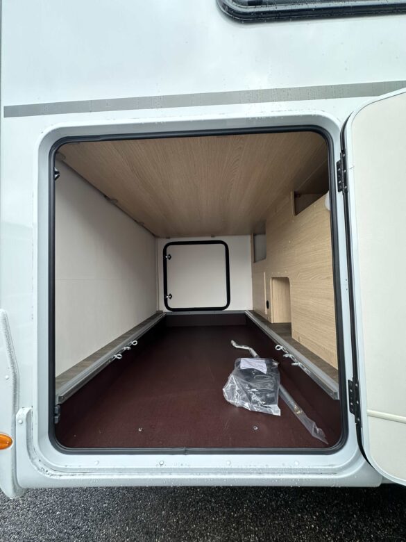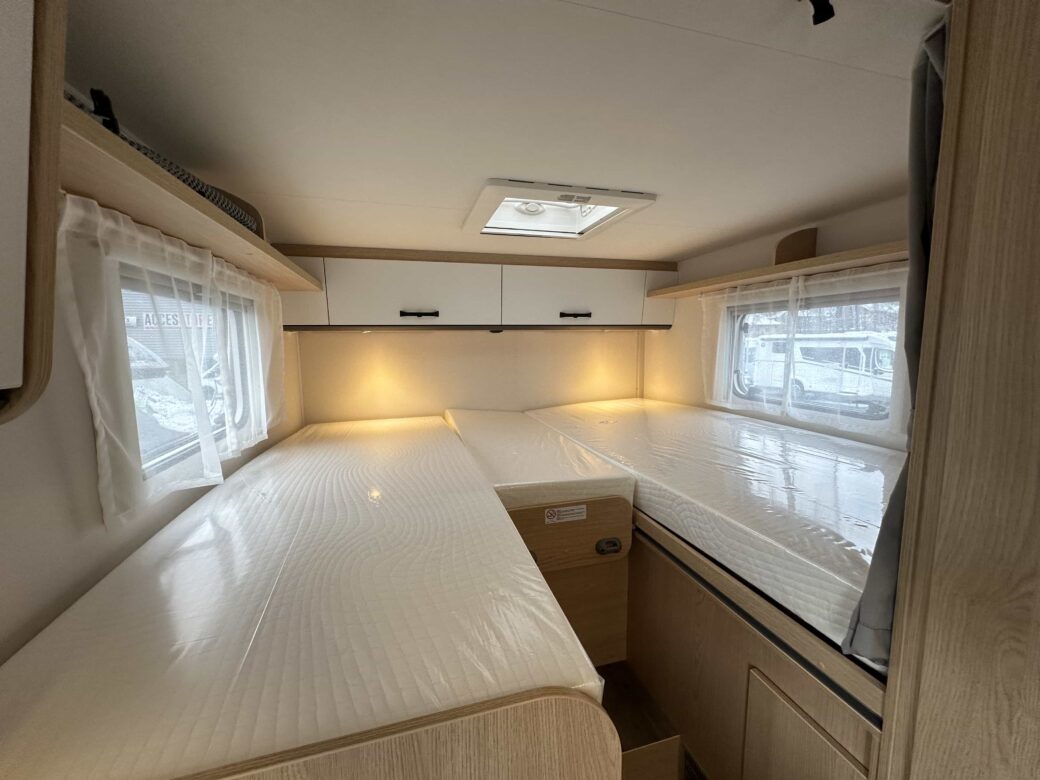 Son implantation offre deux lits jumeaux (transformables en grand couchage) sur grande soute garage, une salle de bain avec système de paroi « Vario », et un bloc cuisine avec un grand plan de travail.
