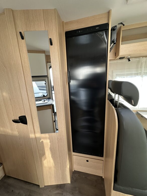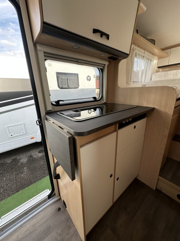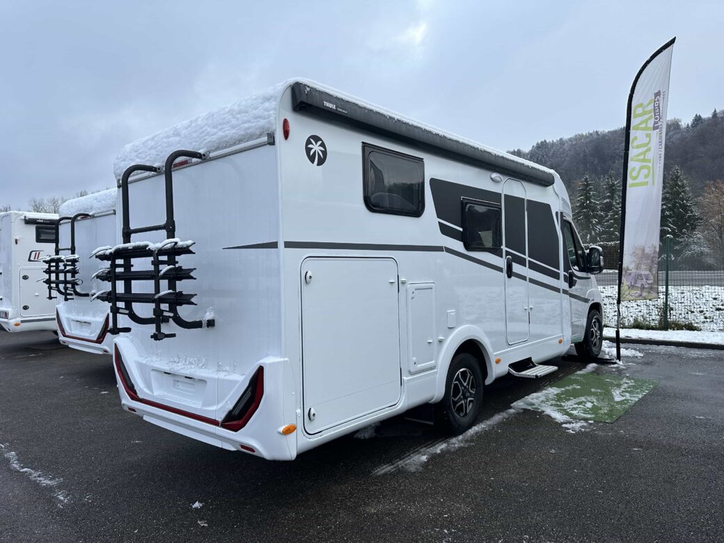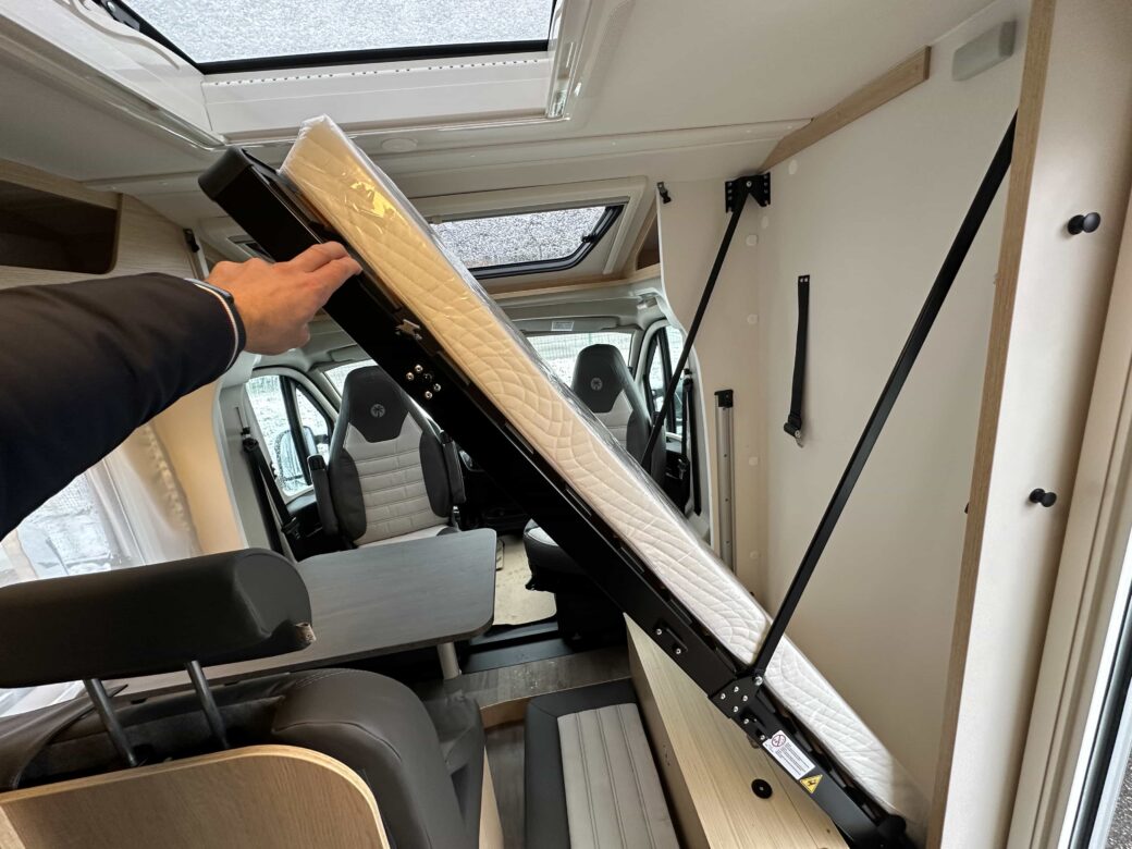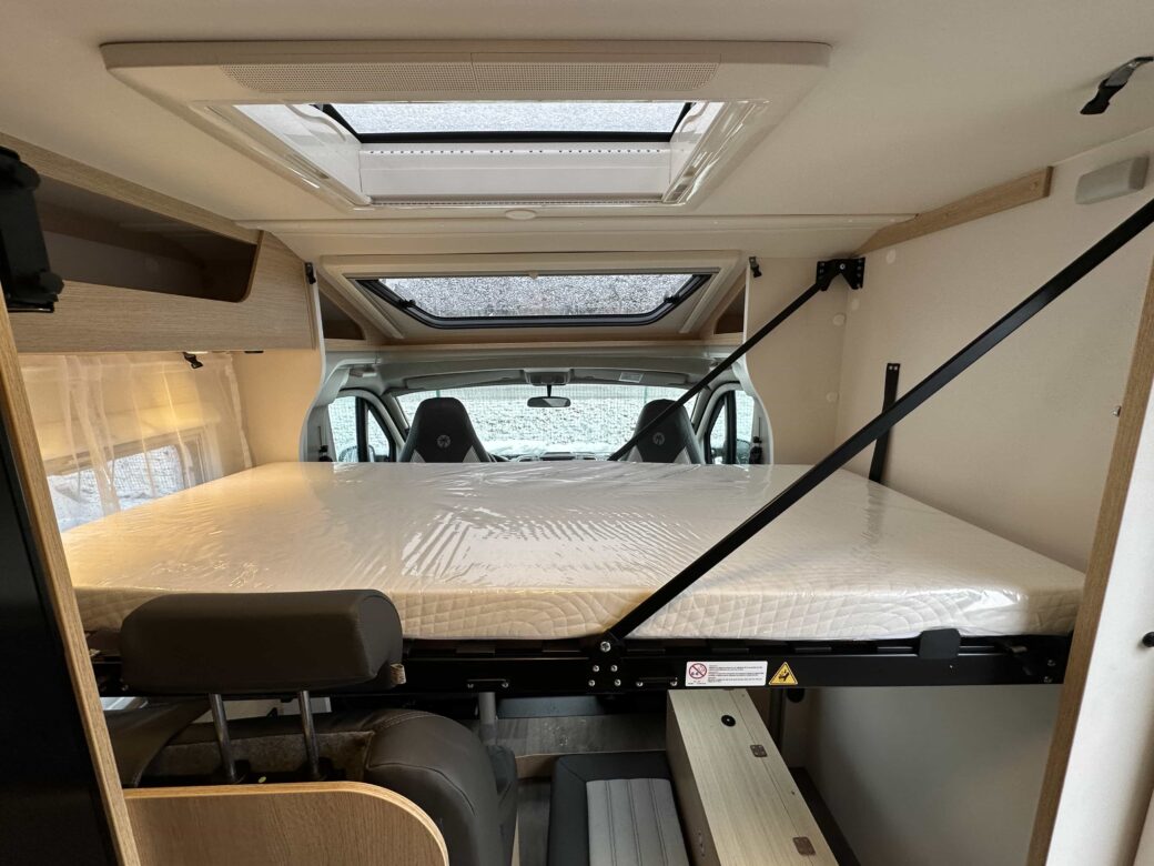 Son implantation offre deux lits jumeaux (transformables en grand couchage) sur grande soute garage, une salle de bain avec système de paroi « Vario », et un bloc cuisine avec un grand plan de travail.